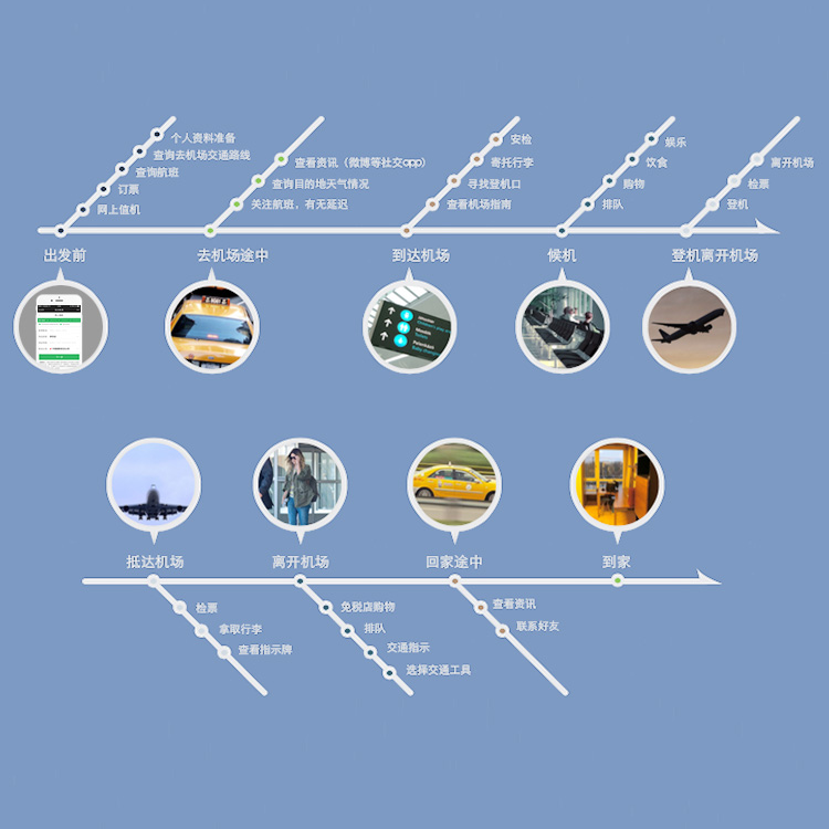 通过对核心使用人群的综合分析,定义出整个出行流程中,用户使用白云机场微信APP的7个必不可少的使用场景。