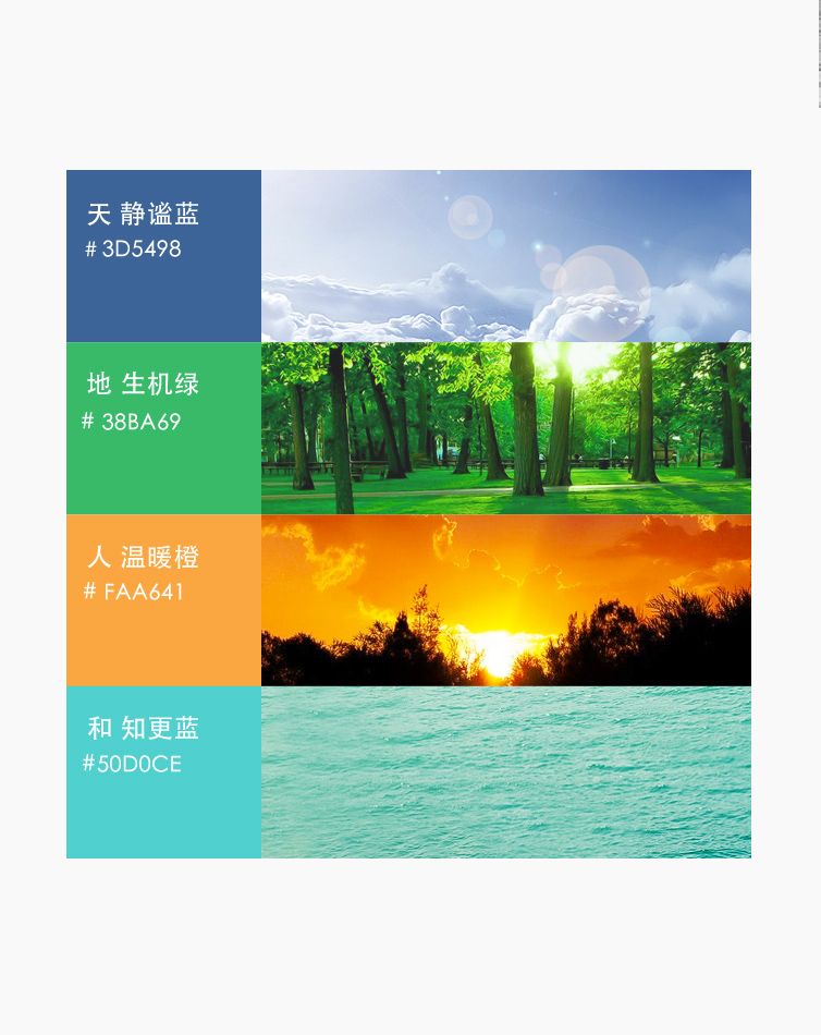 通过品牌主色调的分析,我们结合“天、地、人、和”的核心概念,将品牌辅助色进行了延伸设计。通过把导航设计的四个分类,主题色调进行延伸设计,增加品牌的认知度,也从视觉上引导用户使用APP上的各种功能,达到一种情感上的共鸣。