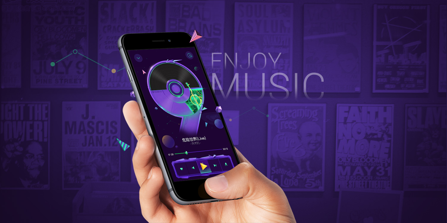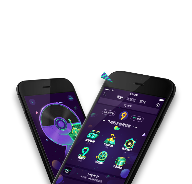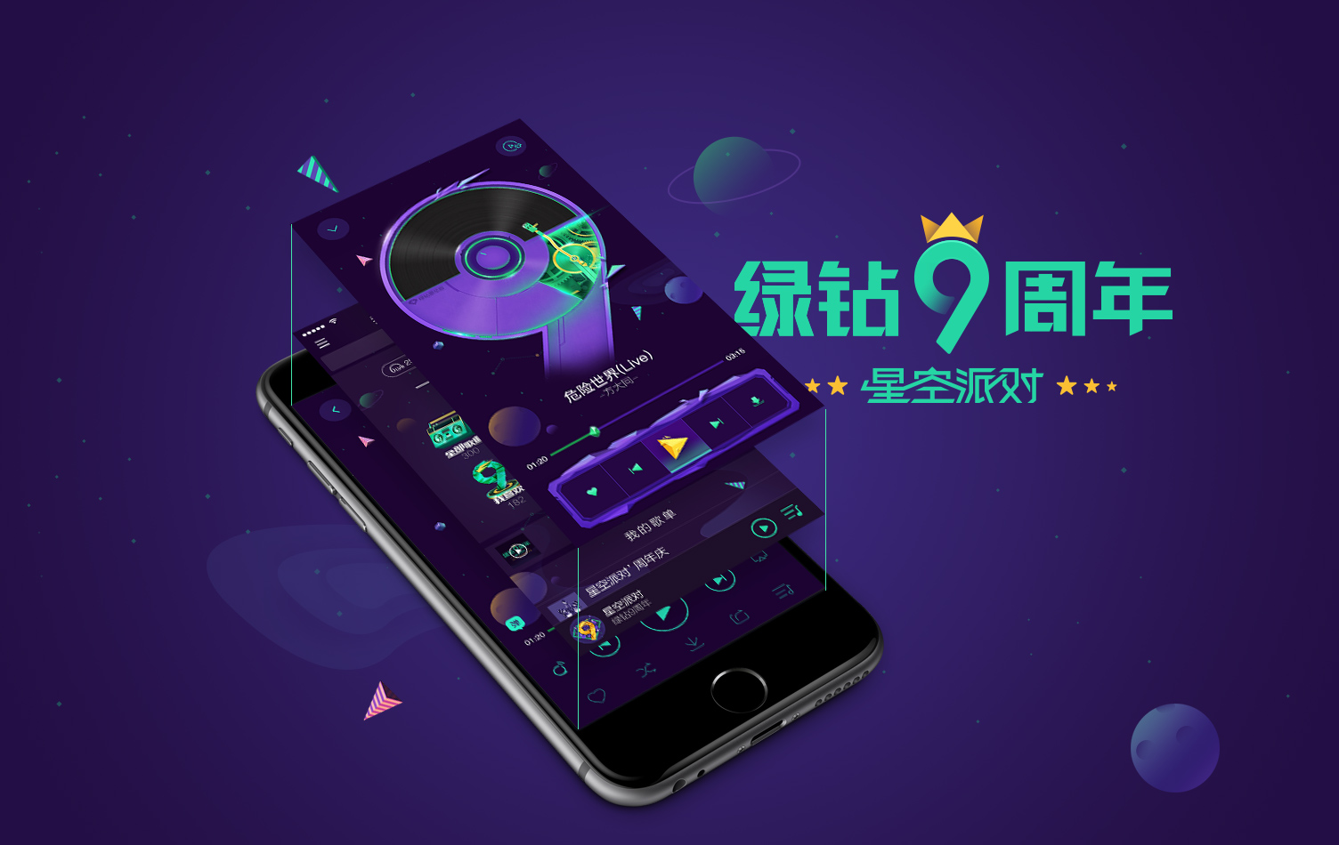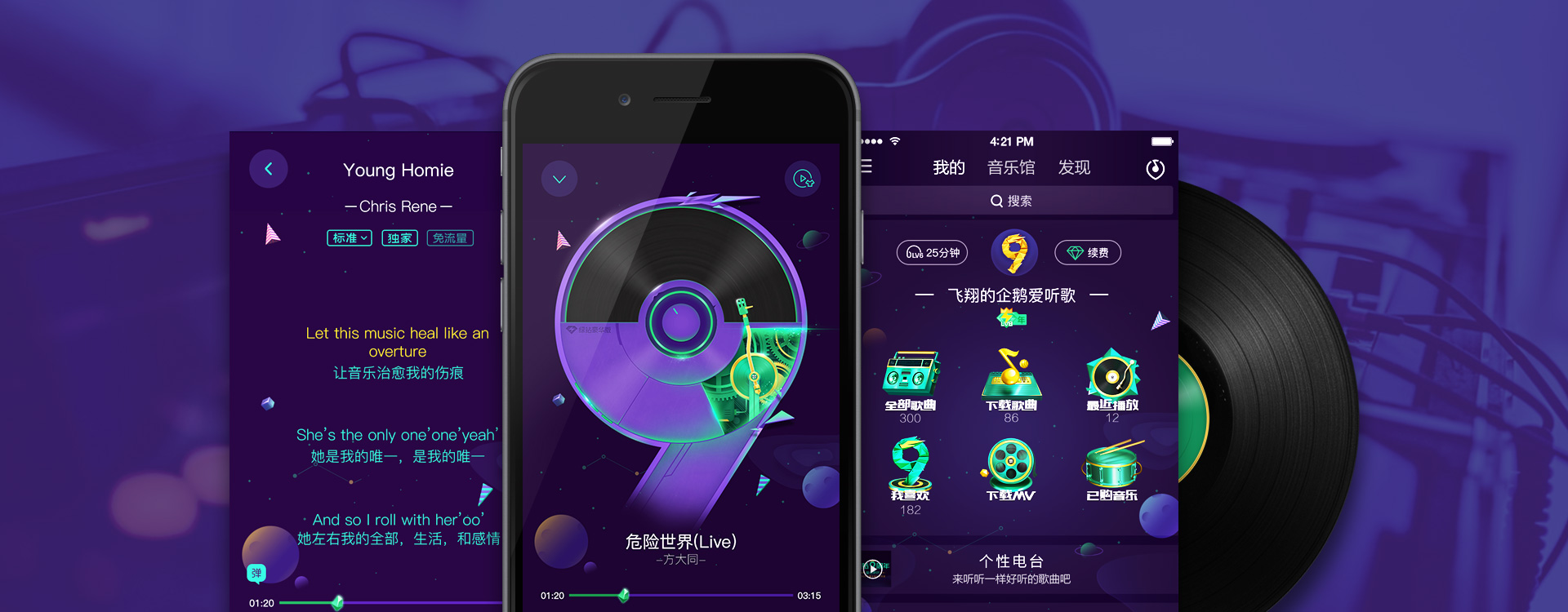 播放器整体外形设计从“9”的数字外形上进行变形和黑胶唱片的外形结合。呼应9周年主题含义与体现播放器页面音乐器材的交互表现。