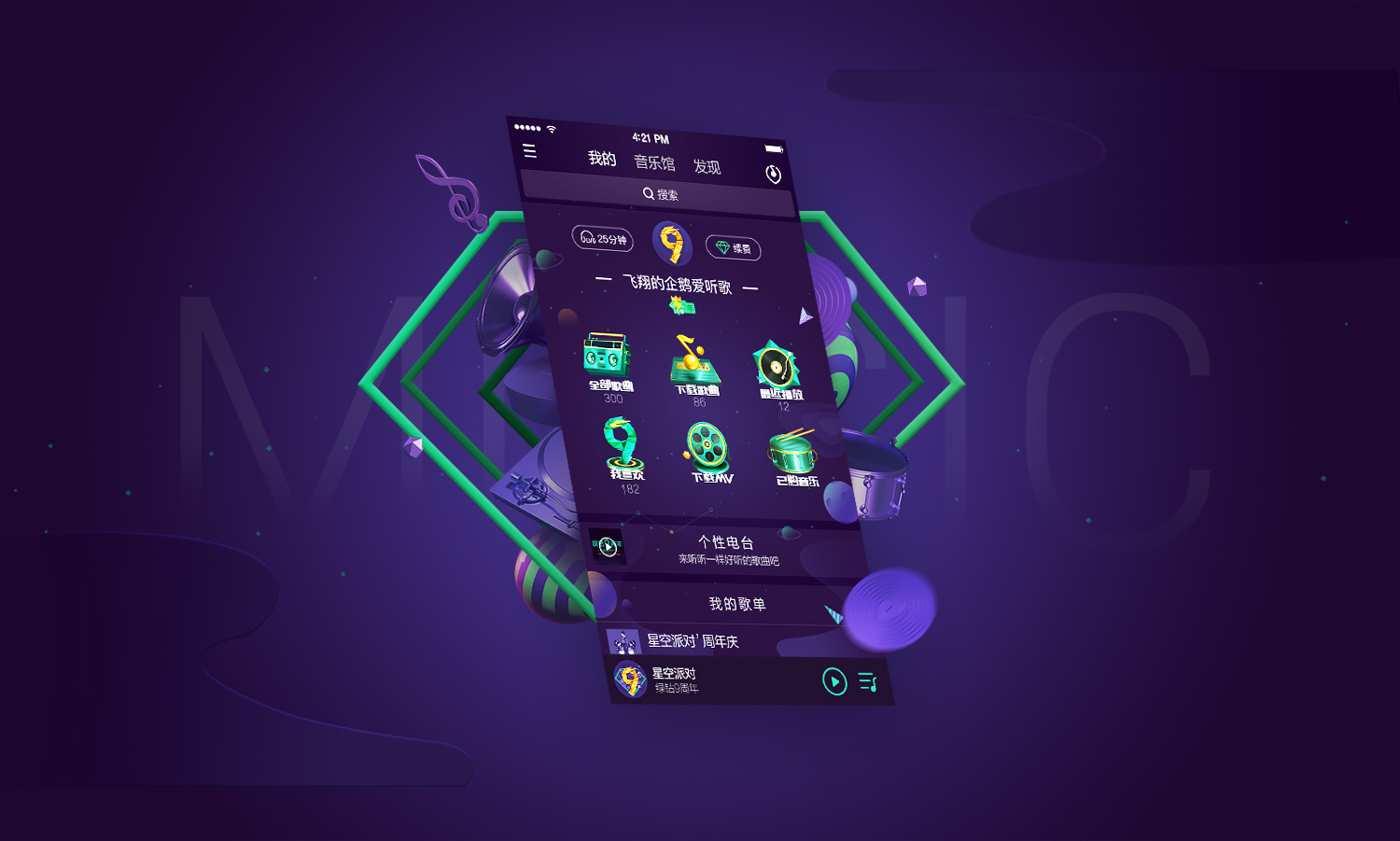 了解到app的用户群多为年轻学生,所以在配色上尝试个性,有张力的配色,并且用色上贴合“音乐”、“宇宙”两个关键词。