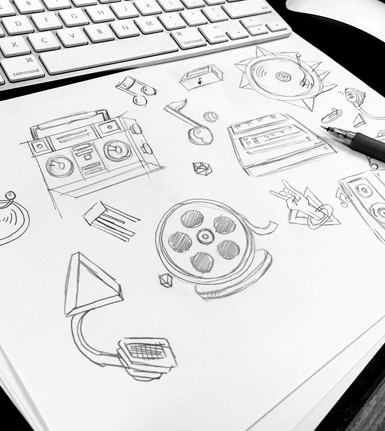 不断环绕着“音乐”、“宇宙”两个关键词进行灵感草图绘制,提取合适的元素,从而进行后续的视觉设计。