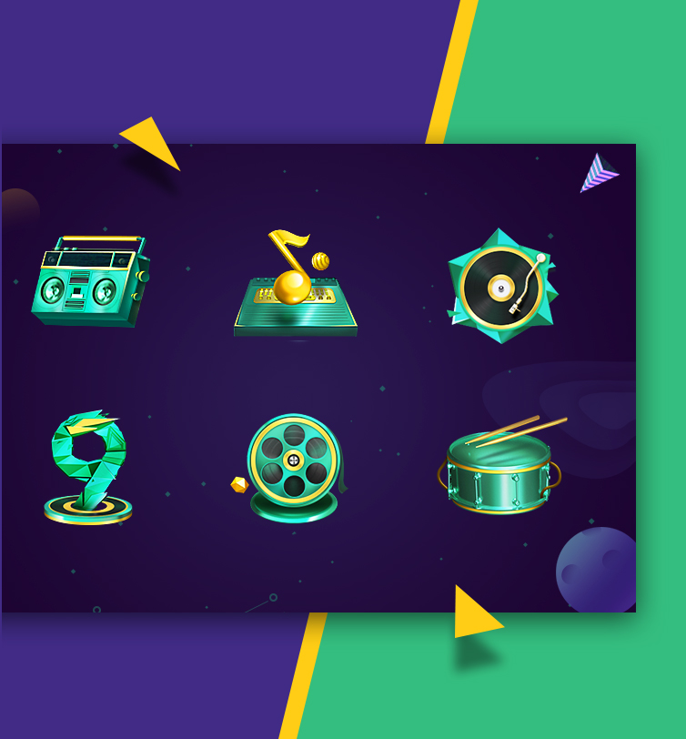 提取主要的设计元素,在保证视觉上美观的同时,我们也保证了作为功能图标必须有的识别性。搭配音乐器材,以及宇宙陨石,适当的色彩点缀以及细节让整体设计不显单调。