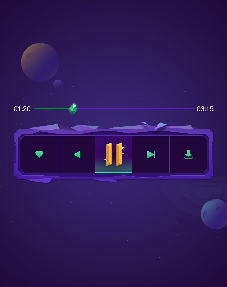 为了使下方的播放控件更能表达主题氛围,所以把控件的外框设计成宇宙陨石,附近伴随着凌乱的碎片。颜色搭配上也遵循严格的配色比例。强调主题调性,让整体设计更为统一。