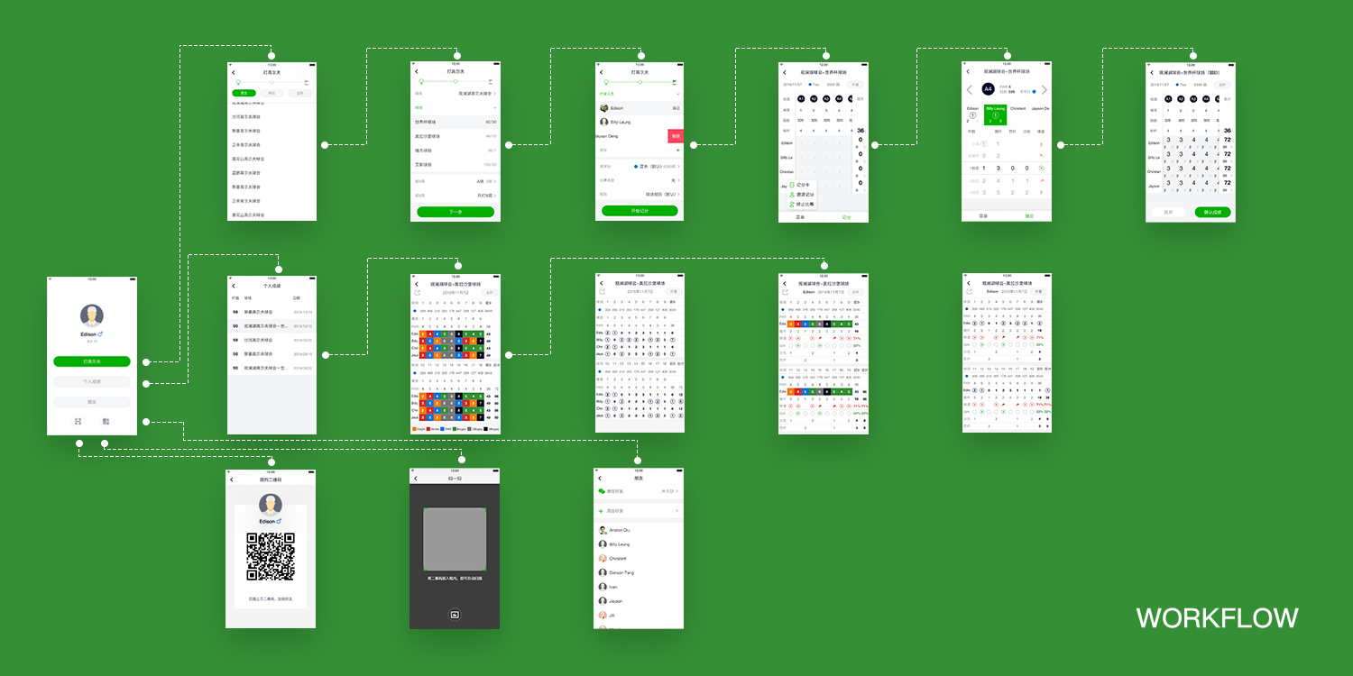 一改复杂的高尔夫记分辅助应用使用流程,我们将整个打球记分流程简化整合,为了强调极简易用的核心,我们在设计风格上力求克制,弱化“设计感”,提高整体界面的信息传达能力,为用户带来更愉悦流畅的使用体验。同时增加邀请辅助记分即时响应的场景,用户和用户可以相互感知状态,或者相互发送请求和响应请求。