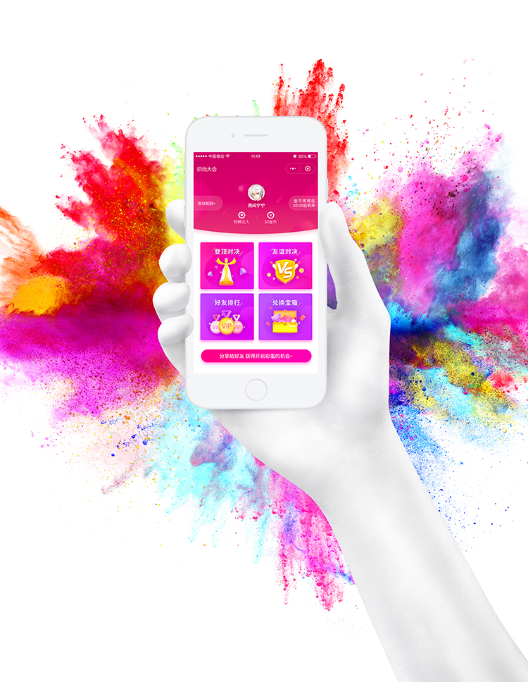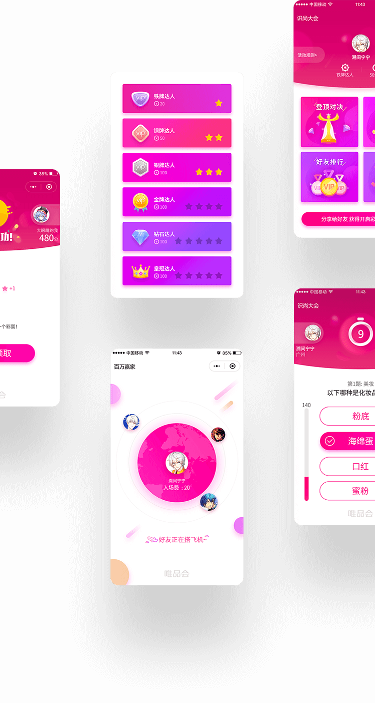 我们基于唯品会的品牌调性,搭配其品牌颜色,营造时尚、潮流、轻松的游戏氛围。通过色彩和图形元素,提高小程序的品牌辨识度,达到宣传的最大效果。