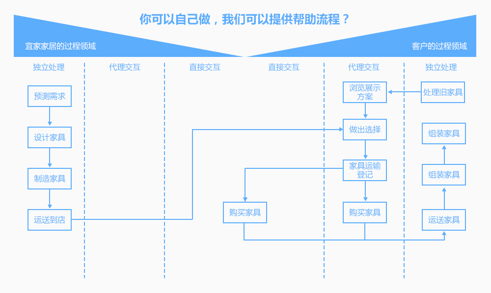传统的企业售卖的时候是对客户针对性的推销,购买之后还要帮你组装、打扫及测试使用,而宜家家居是你咨询的时候我会告诉你,但是我不会帮助你(除了买单这一项是有服务的,其他都是用户自己动手,包括运货、组装)。