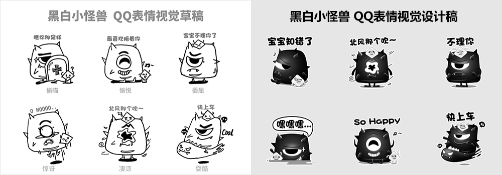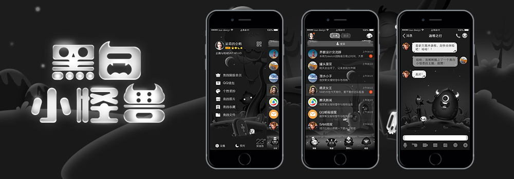 JUNZIE:可以。最近刚完成一款“黑白小怪兽”的手机QQ主题皮肤联合聊天表情、气泡的产品设计项目。这里可以先介绍一下,手机QQ主题、聊天表情、聊天气泡等,是QQ针对90后以及更年轻的用户群特点开发的一系列运营推广产品。大家理解的90后、95后都是比较个性张扬、潮流时尚的一代,针对目标用户群的研究和分析,本次“黑白小怪兽”项目,我们以“探秘两只蠢萌调皮的小怪兽日常”为思路展开本次产品设计。