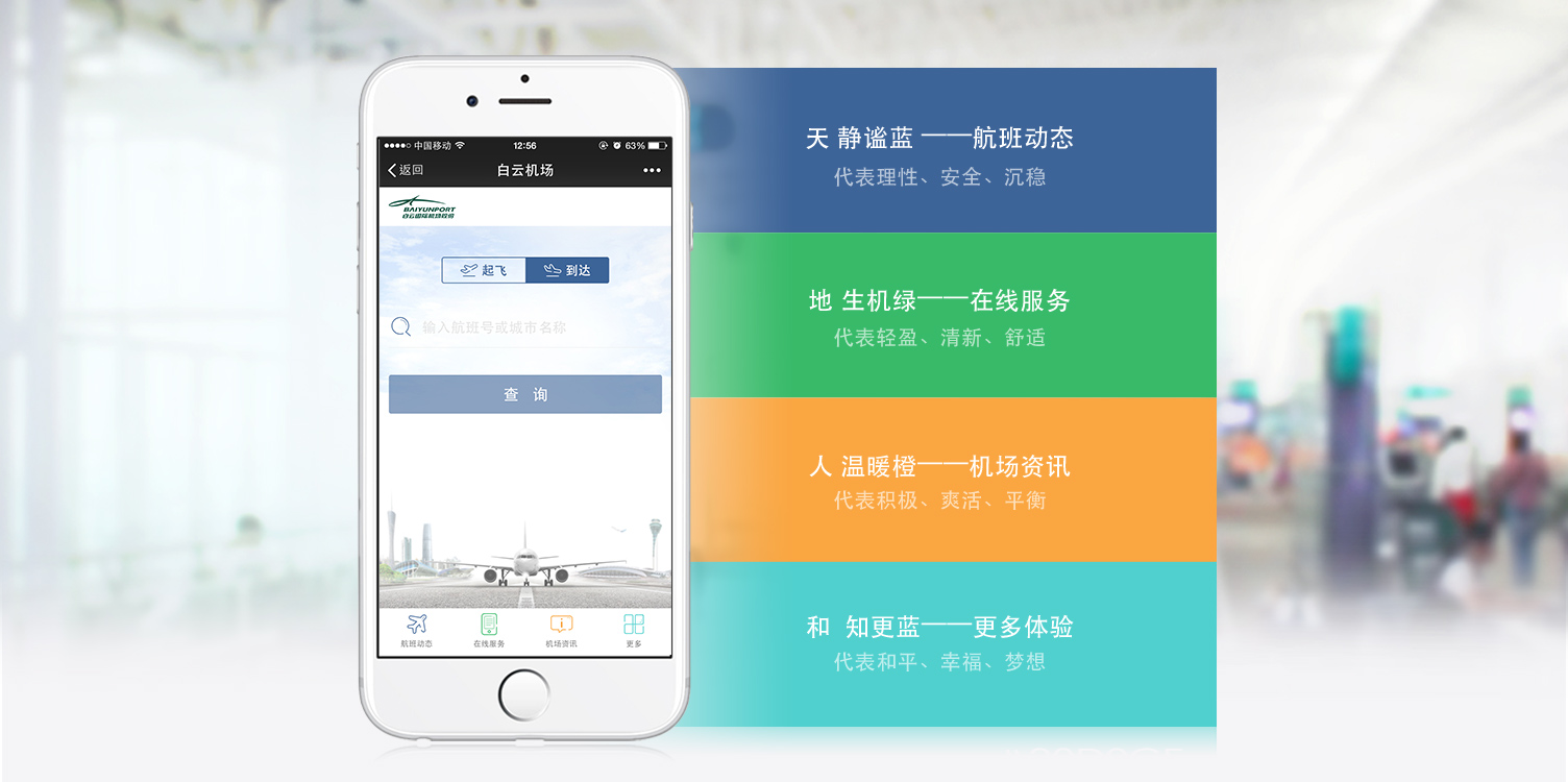 这是亦是具有白云国际机场唯一品牌特性的设计“天、地、人”的核心概念贯彻展示于主页面当中,顶部明亮天空背景为天,体现安全;中部飞机降落至跑道为地,体验为舒适;底部功能区为人,体现温暖的服务,画面富有层次感。
