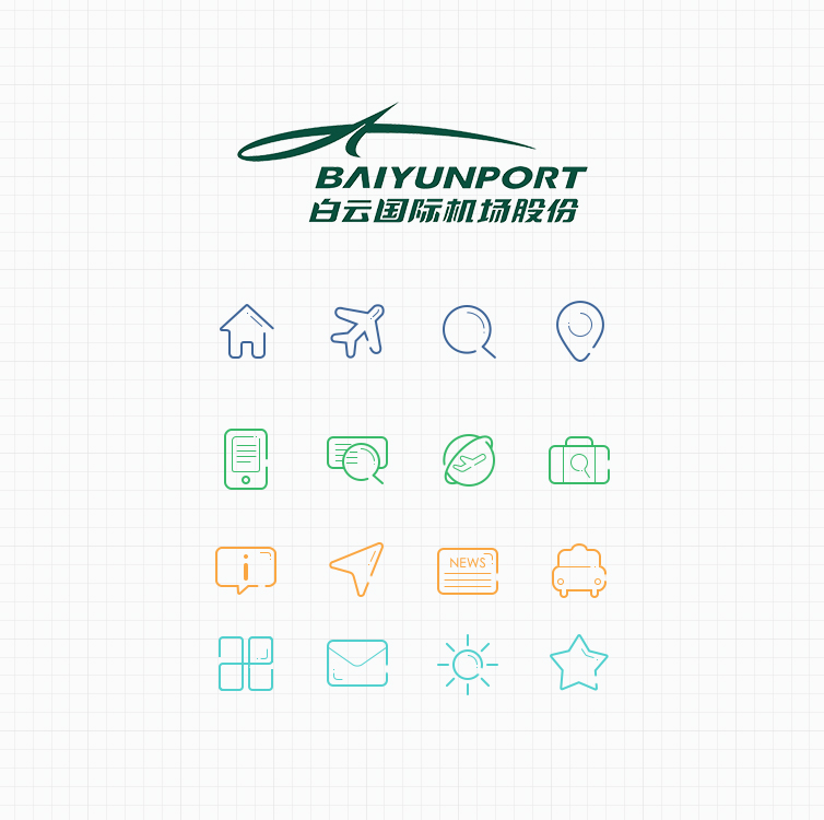 整体图标设计根据不同的主题色调,以白云机场LOGO的弧线造型作为延伸演变,一线成型。