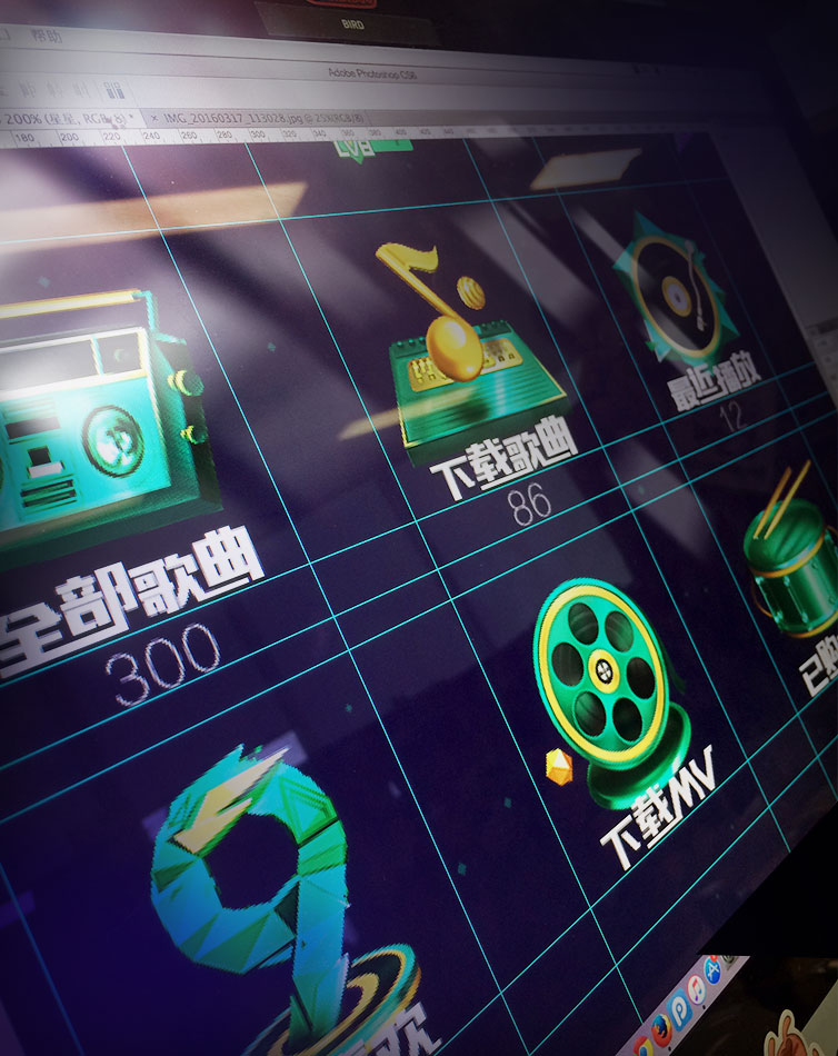 提取主要的设计元素,在保证视觉上美观的同时,我们也保证了作为功能图标必须有的识别性。搭配音乐器材,以及宇宙陨石,适当的色彩点缀以及细节让整体设计不显单调。