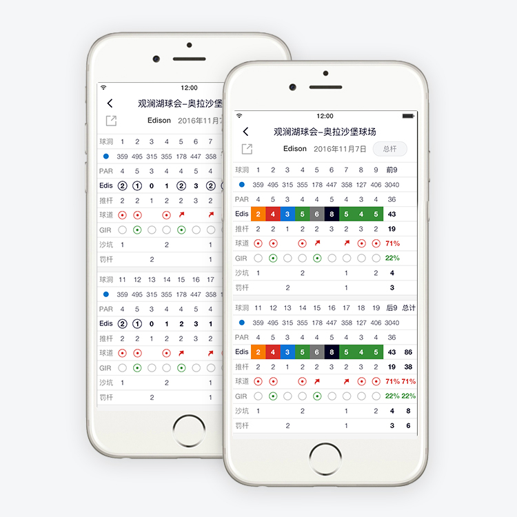 记分卡设计上,我们采用了杆差显示和总杆显示两种展示模式,以适应不同用户的使用习惯。