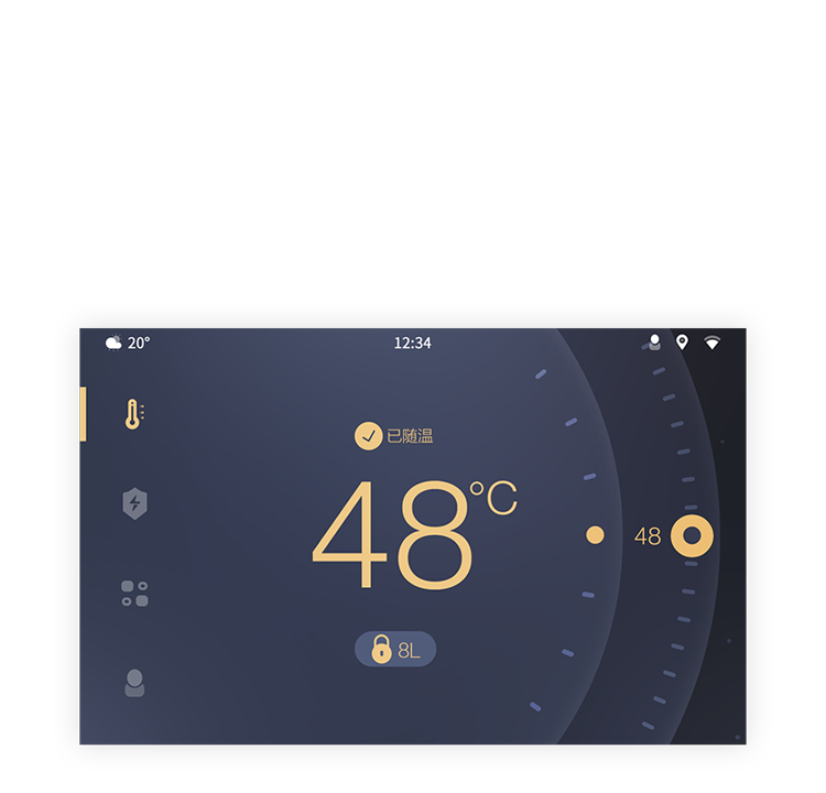 界面排版上把重要的内容展示给用户,以转盘调温的形式将用户调温的操作作为主要考虑的点,且减少操作误区。首盘为快速调节,分为:35、40、45、50、55、60、65七个刻度区;次盘为精准调节,针对具体温度进行微调。