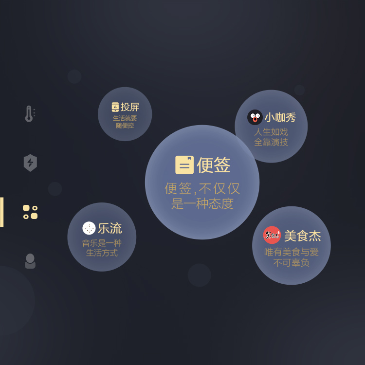 智能、高效、便捷,应该是新时代产品需要拥有的特性。好的交互体验,能使产品在使用的过程中更加深入人心。而更多功能页,根据用户的使用习惯,将用户常用的功能放大,置于最前方,不常用的缩小弱化。当用户不操作界面时,页面气泡球体轻盈浮动,相互碰撞,缓慢散开。如煮水时水中产生的点点气泡。
