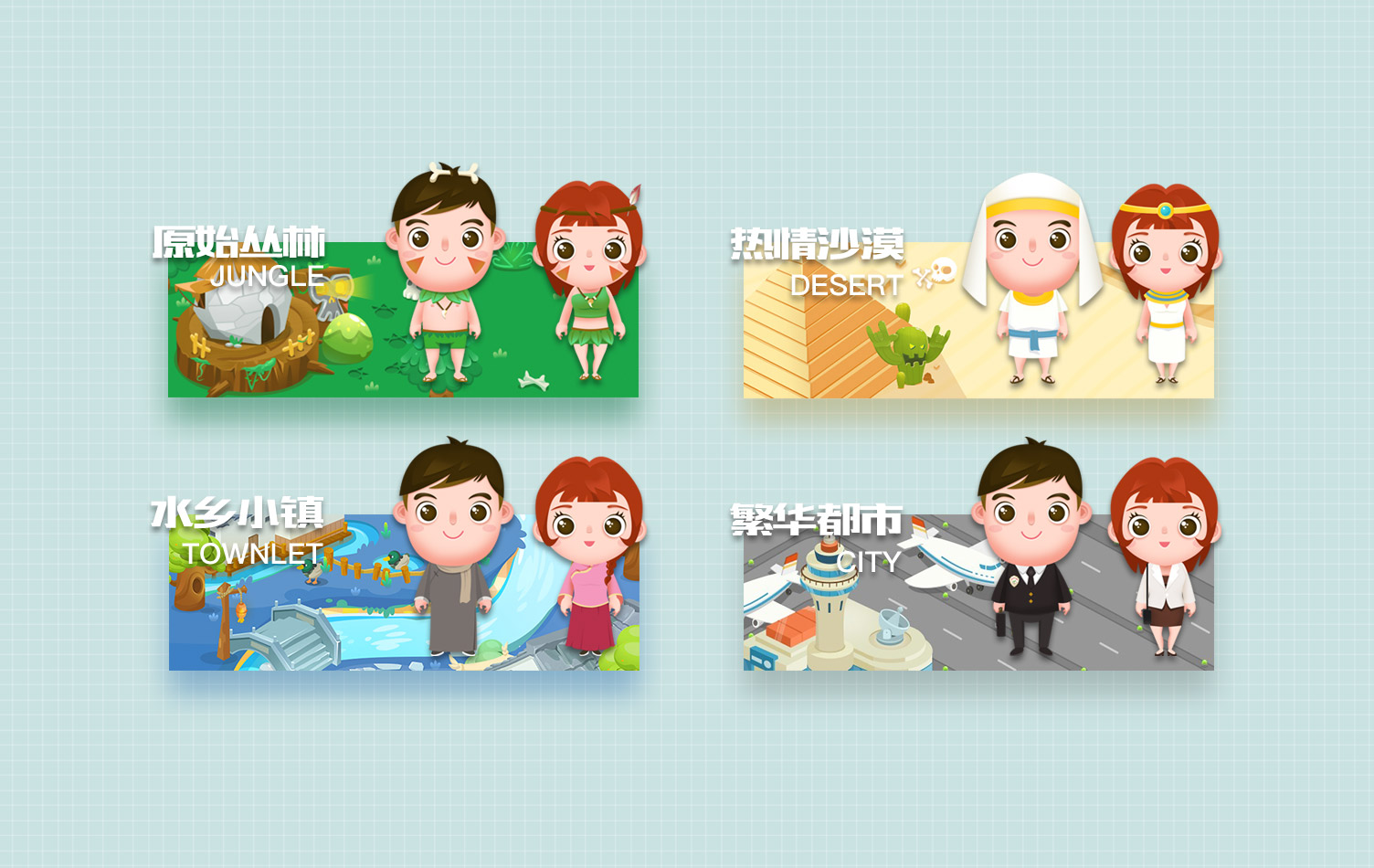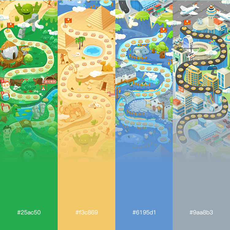 游戏场景上,我们分别设计了原始丛林,沙漠,水乡小镇,繁华都市四大场景,通过用户的不断游玩升级而解锁。每张地图都极具场景特征。每张地图通过专属的色彩倾向,让用户得到更好的识别性。