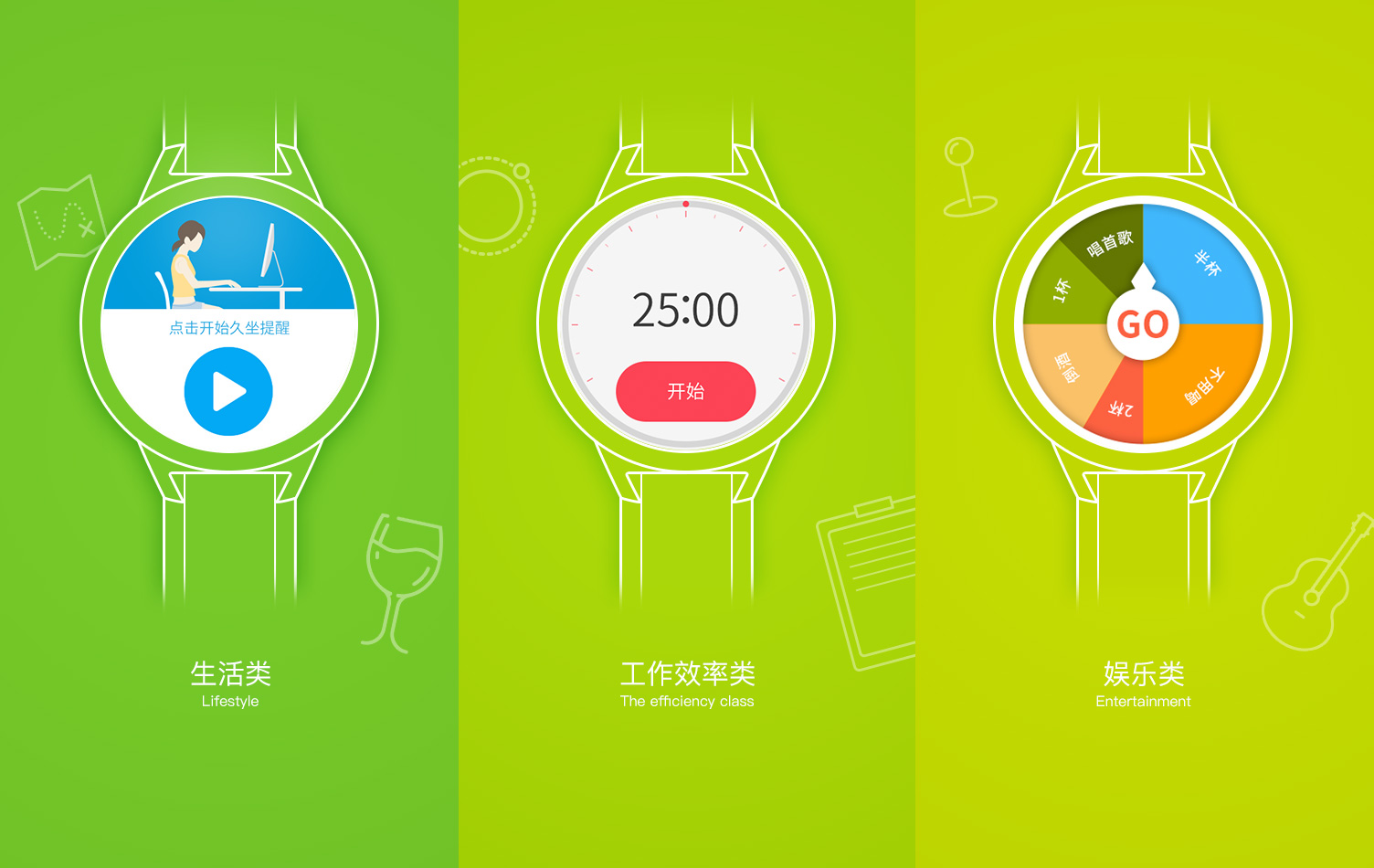 在本次智能手表应用设计上,我们一共设计了三大类型。分别是生活类、工作效率类、娱乐类。虽然应用类型不同,但是我们遵行我们的设计准则与设计语言,提高统一性。
