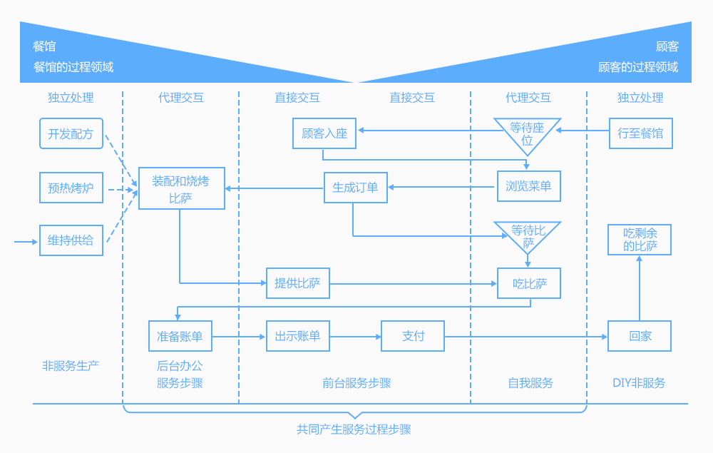 4.服务是交互过程:我们把“服务”看作过程的交互部分。用“服务”来描述顾客-提供者的交互过程。