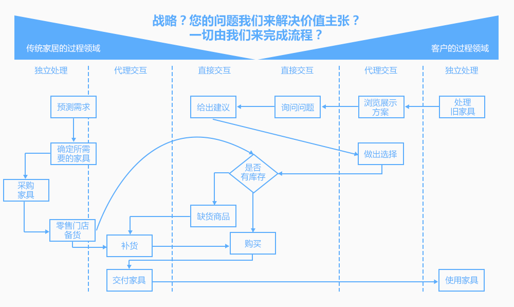 1)哪个过程服务体验好且能够给企业带来价值的?那就是客户浏览的过程,这个过程中客户产生购买的欲望(宜家的策略)。宜家路线的限制即加强了代理互动,让用户跟店内陈设的方案产生互动,店内商品产生互动,他们墙上的标示有小路线,但是不明显,这就是为了加强战略性互动,让用户浏览他所有的产品,同时节约成本。