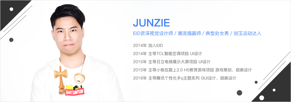 视觉设计师、潮流插画师、典型处女男、剑玉运动达人;这些都是本期访谈嘉宾拥有的名头,JUNZIE——EID资深视觉设计师,喜欢将一切细节都控制在最完美的状态,致力将情感效果融入视觉设计中。