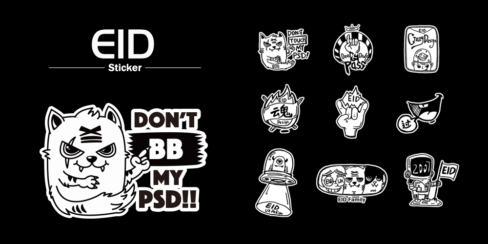 JUNZIE:我想以EID为创作背景,将潮流文化、热血动漫、个性叛逆这些元素融合到我的创作中,其中“DON’T BB MY PSD!!”的贴纸,创意灵感来源于网上一个关于设计师的段子,“每个设计师背后都有一堆指点江山的大神”,该贴纸的形象是一只脸上有刀疤的猫,猫也是EID的吉祥物,我们公司就养了两只猫猫,我们都喜欢叫EID做猫厂,而这两只猫猫也是设计师们的安抚师。这张猫猫贴纸非常具有故事性,就像一个充满个性而且自信的设计师对那些指点江山的大神说,“别质疑我的专业”。EID创意贴纸非常能体现设计师内心的一些想法和诉求,像“一稿pass”、“Crazy Design”等等,“EID Family”、“EID 2007”则能使贴纸与EID设计师们产生一种情感上的连接。