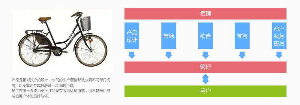 到现代的企业中,因应不同的职责工作人员被分成不同的部门。每个部门中的人只需要完成各自清晰的部门目标。所有部门共同协作完成产品的设计到生产的全流程。然而,看似大家同心协力去创造产品,但却没有哪一个企业中的个体需要为最终给的用户体验负责。