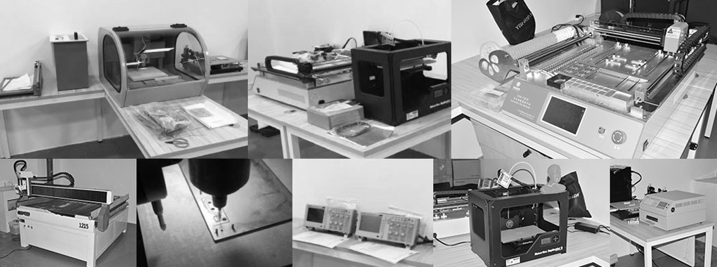 智能产品实验室拥有一条生产智能产品的完整生产线。包括PCB制版机、贴片机、自动焊接机、自动雕刻机、3D打印机等设备,以及其他电子设备测试仪器。依托智能产品实验室的相关设备,可以在产品设计验证阶段快速小批量生产以及装配智能产品原型。包括:PCB制版,电子元件自动贴片,自动焊接,程序烧录,CNC模型制作,3D打印模型制作等。